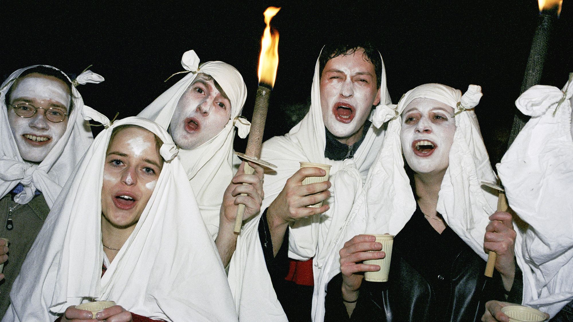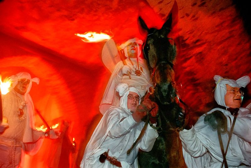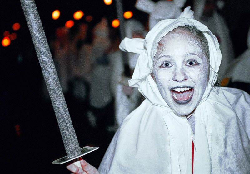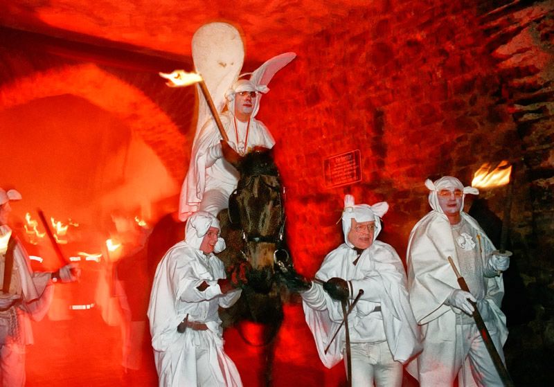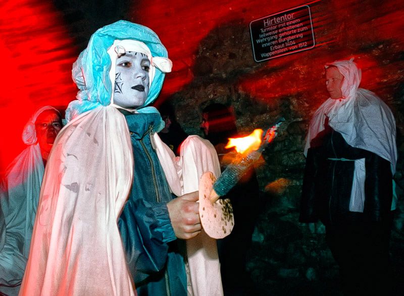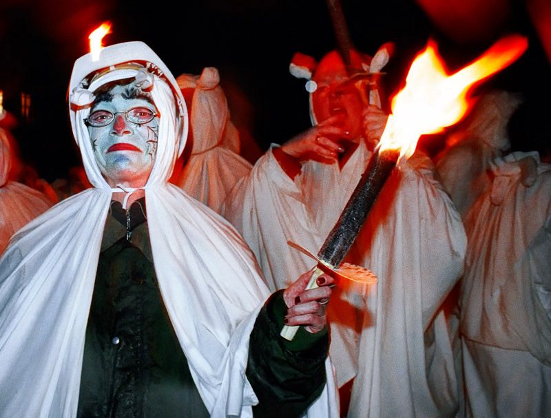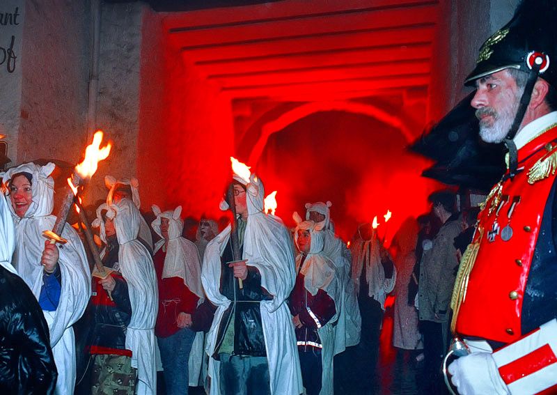 In weiße Laken gehüllte Geister springen mit Pechfackeln in der Hand und Juh-Jah rufend durch die verdunkelten Gassen um den Winter auszutreiben.